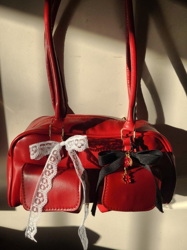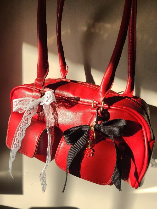 Cartera rojo cereza con asas y dos bolsillos exteriores.